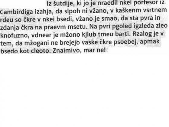 Iz študije, ki jo je naredil neki profesor iz Cambridga izhaja, da sploh ni važno v kakšnem vrsten redu so črke v neki besedi, važno je samo, da sta prva in zadnja črka na pravem mestu. Na prvi pogled izgleda zelo konfuzno, vendar je možno kljub temu brati. Razlog je v tem, da možgani ne berejo vsake črke posebej, ampak besedo kot celoto. Zanimivo, mar ne!
