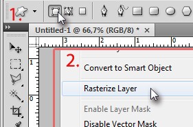 Probaj tako da izbereš prvo ikonco(tiste male ikonce mislim) pri shape tool, da se ti zapolne takoj z barvo, nato pa z desnim klikom na paleti layerjev izberi resterize layer.