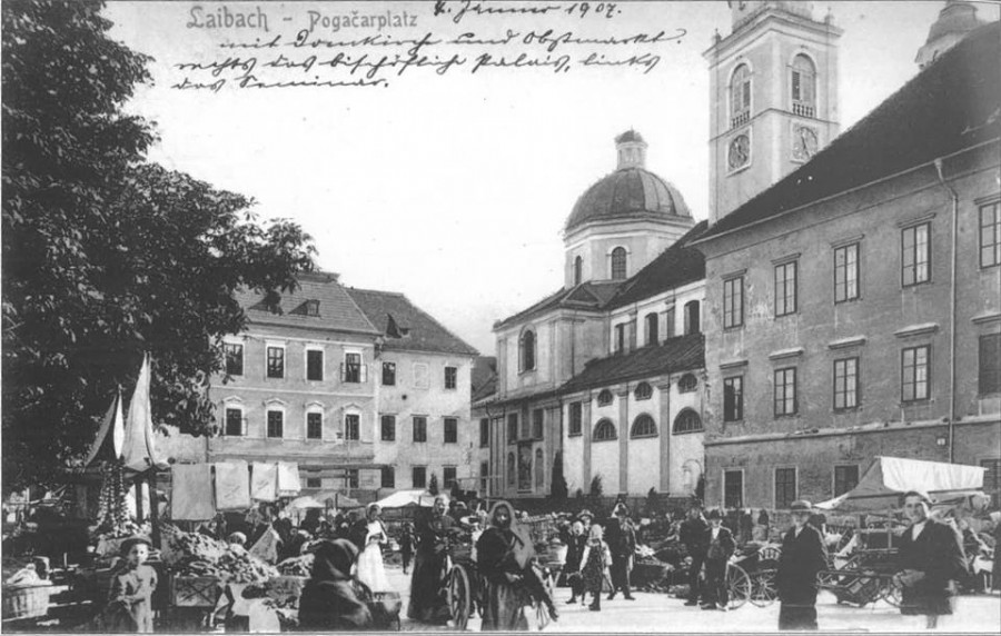 Pogačarjev trg s semeniščem, stolnico in škofijo leta 1906