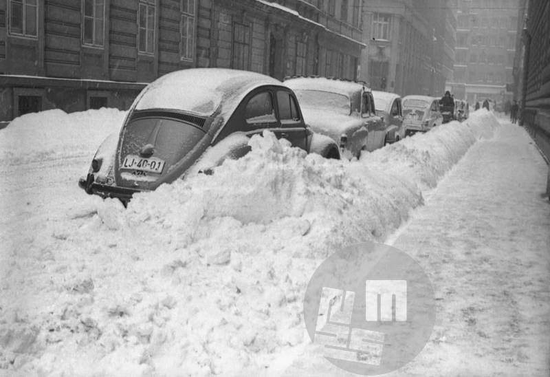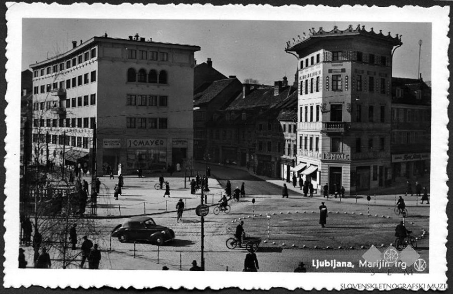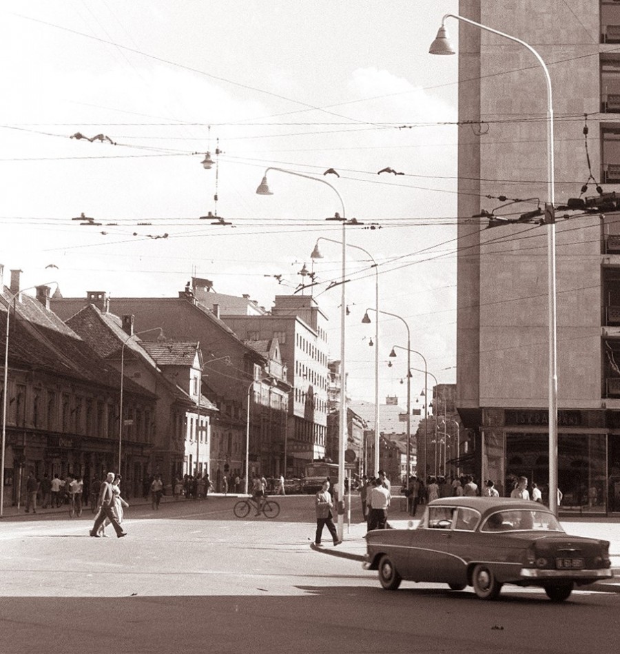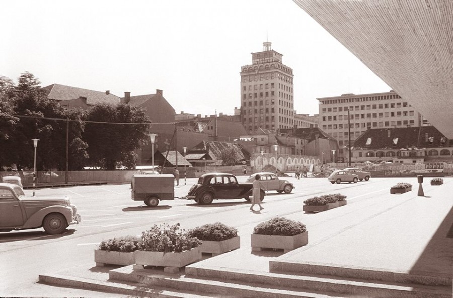 Parkirišče pred trgovino Prehrana za Metalko leta 1961.