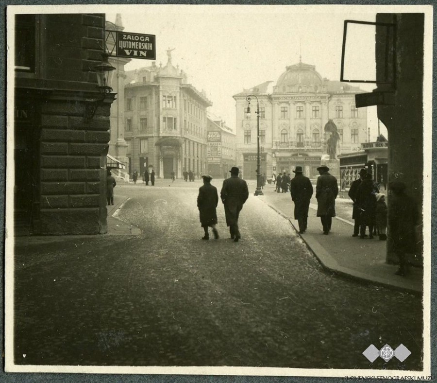 Prešernov trg z Wolfove ulice okoli 1930.Avtor fotografije: Joža Kozak Vir: Slovenski etnografski muzej,