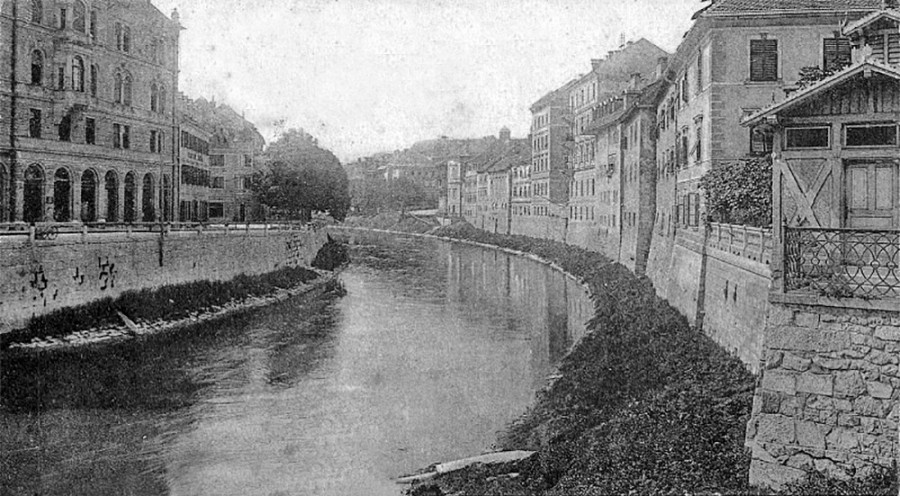 Cankarjevo in Hribarjevo nabrežje Ljubljanice leta 1908.
