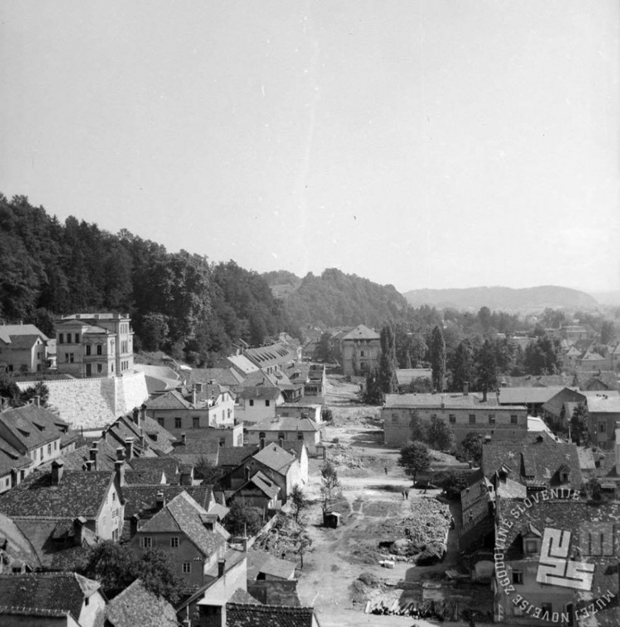 Rušenje hiš za izgradnjo (širitev) Dolenjske ceste v Ljubljani verjetno leta 1958. Fotografijo hrani Muzej novejše zgodovine Slovenije v fondu fotografa Edija Šelhausa