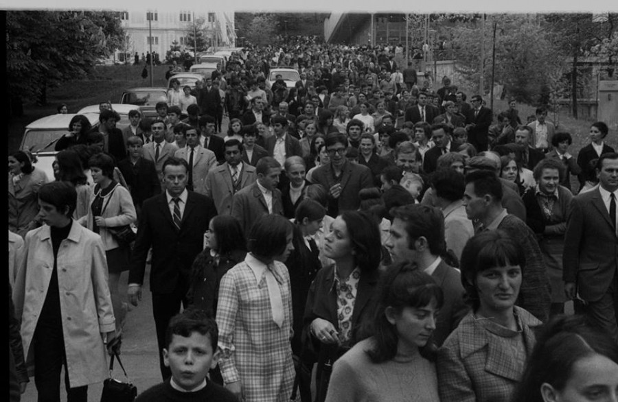 Množica gledalcev po otvoritvi finala košarkaškega prvenstva leta 1970 zapušča Halo Tivoli. Foto: Marjan Ciglič Hrani: MNZS