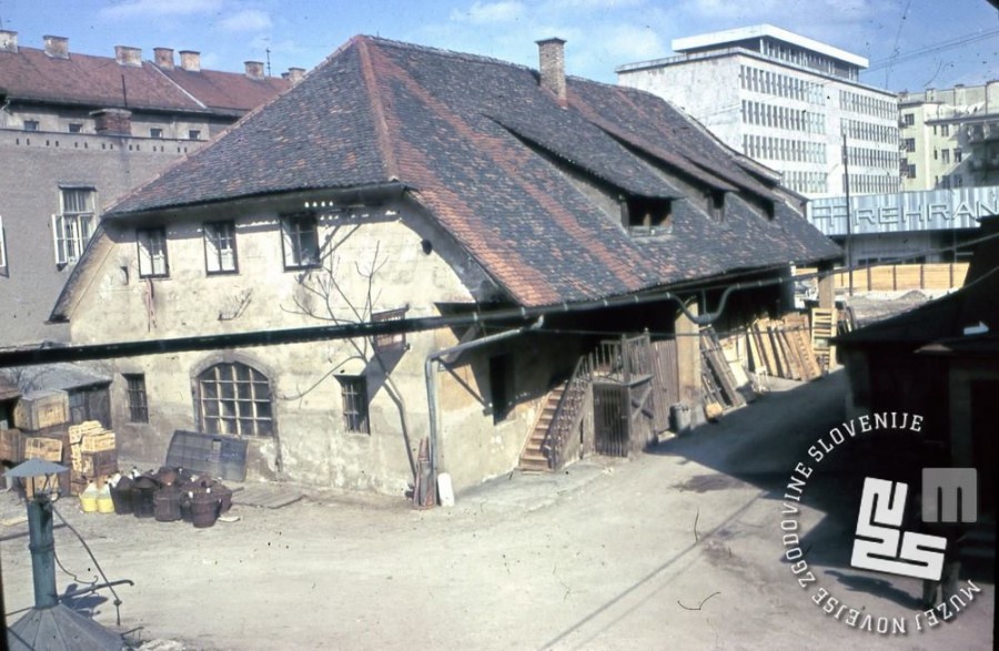 Tik pred začetkom rušenja starih objektov Metalke. Na tem mestu danes stoji Metalka. Zadaj je vidna trgovina Prehrana, ki stoji še danes. Avtor fotografije: Svetozar Guček.