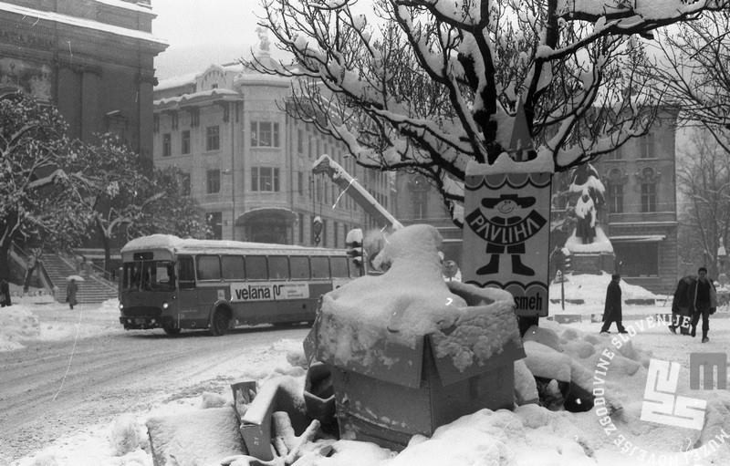 Avtobus mestnega prometa na Prešernovem trgu. Ljubljana, januar 1987, foto: Marjan Ciglič. Fotografijo hrani Muzej novejše zgodovine Slovenije v fondu fotografa Marjana Cigliča.