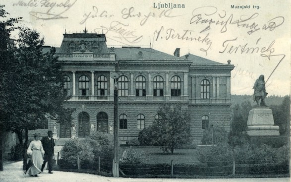 1888, danes Narodni muzej, takrat Deželni muzej. Spredaj je spomenik Valvasorju.